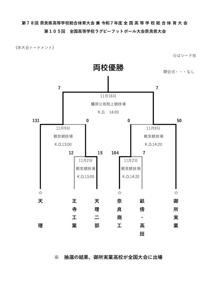 第78回 奈良県高等学校総合体育大会 兼 令和7年度 全国高等学校総合体育大会/第105回 全国高等学校ラグビーフットボール大会奈良県大会≪結果≫ 2025 11/19 試合結果・報告 高校 2025年11月19日 試合結果・報告 高校 NARA Rugby ラグビー 高校ラグビー hanazno 花園 よかったらシェアしてね! URLをコピーしました! URLをコピーしました! 第74回 近畿中学校総合体育大会ラグビーフットボールの部≪組み合わせ≫ 関連記事 第78回 奈良県高等学校総合体育大会 兼 令和7年度 全国高等学校総合体育大会/第105回 全国高等学校ラグビーフットボール大会奈良県大会≪組み合わせ≫ 2025年9月14日 第76回 奈良県中学校総合体育大会ラグビーフットボールの部≪観戦記≫ 2025年9月14日 第79回 国民スポーツ大会-近畿ブロック大会-ラグビーフットボール競技≪全試合結果≫ 2025年9月1日 第79回 国民スポーツ大会-近畿ブロック大会-ラグビーフットボール競技≪8/28女子の部/試合結果≫ 2025年8月28日 第79回 国民スポーツ大会-近畿ブロック大会-ラグビーフットボール競技≪8/28少年の部/試合結果≫ 2025年8月28日 第79回 国民スポーツ大会-近畿ブロック大会-ラグビーフットボール競技 組み合わせ 2025年8月21日 国際交流試合≪結果≫ 2025年8月5日 第1回 NARA SEVENS≪結果≫ 2025年6月24日