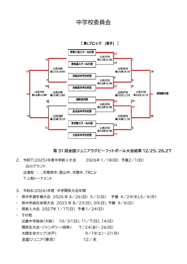 【報告】中学校委員会より-直近の試合報告・2026年度大会予定- 2026 1/14 試合結果・報告 ジュニア 中学 委員会 2026年1月14日 試合結果・報告 ジュニア 中学 委員会 Rugby ラグビー 奈良 ジュニア TRCジュニア よかったらシェアしてね! URLをコピーしました! URLをコピーしました! 【報告】ミニラグビー普及育成委員会より-活動報告・計画- 奈良県C級コーチ講習会のご案内 関連記事 第77回 近畿高等学校ラグビーフットボール大会≪結果≫ 2026年1月25日 第77回 近畿高等学校ラグビーフットボール大会-奈良県予選-≪途中経過≫ 2026年1月23日 奈良県C級コーチ講習会のご案内 2026年1月14日 【報告】ミニラグビー普及育成委員会より-活動報告・計画- 2026年1月14日 【報告】レフリー委員会より-直近の活動報告・2026年度計画- 2026年1月14日 第56回 全国高等学校専門学校ラグビーフットボール大会≪結果≫ 2026年1月14日 第45回 ミニラグビーカーニバル試合≪結果≫ 2025年11月27日 第78回 奈良県高等学校総合体育大会 兼 令和7年度 全国高等学校総合体育大会/第105回 全国高等学校ラグビーフットボール大会奈良県大会≪結果≫ 2025年11月19日